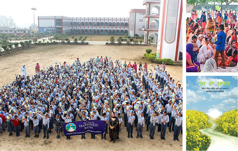 Et af medlemmerne fra Vejen til lykke i Indien besluttede, at den bedste måde at introducere programmet ville være gennem Radha Swami, en større åndelig bevægelse, som hun også er tilhænger af. Hun henvendte sig til Sant Subhash Chander Singh Ji, guru for Radha Swami. Efter at have læst leveregel nr. 2, ”Vær mådeholden”, og set omslaget med ”sennepsmarker” – et anerkendt symbol for velstand for punjabere – godkendte guruen hæftet og anmodede om, at det blev uddelt ved deres årlige åndelige forsamling i Saidpur i Punjab.